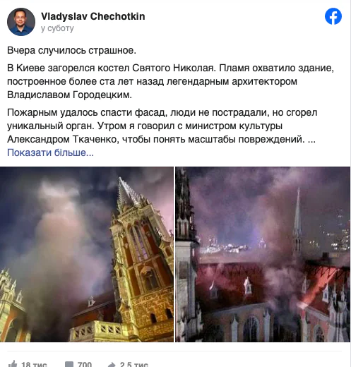 У міністерстві культури України повідомили, що відновлення костелу Святого Миколая, який спалахнув ввечері 3 вересня у Києві, коштуватиме десятки мільйонів гривень.