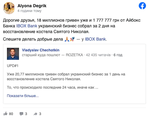 Представники українського бізнесу вже відгукнулися і почали виділяти не маленькі суми на реконструкцію.Лише за перші кулька діб вдалося зібрати 20, 7 мільйонів гривень.