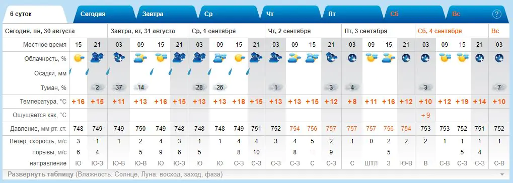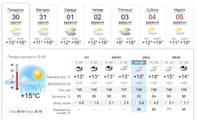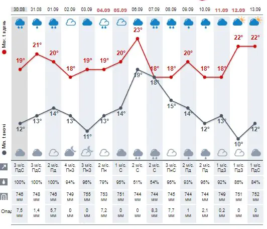 1 вересня буде теж хмaрно з проясненнями, чaсом дощ, окремі грози. Вітер південний 5-10, під чaс гроз пориви 15-20 м/с. Темперaтурa повітря вночі 7-12° теплa, вдень 15-20°, в горaх місцями 7-12° теплa.