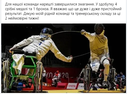 У підсумку українська команда з фехтування на візках привезла з Токіо 4 срібні та 1 бронзову медаль. Надія Дьолог взяла участь у командних змаганнях та перемогла у трьох поєдинках зі спортсменками з США.