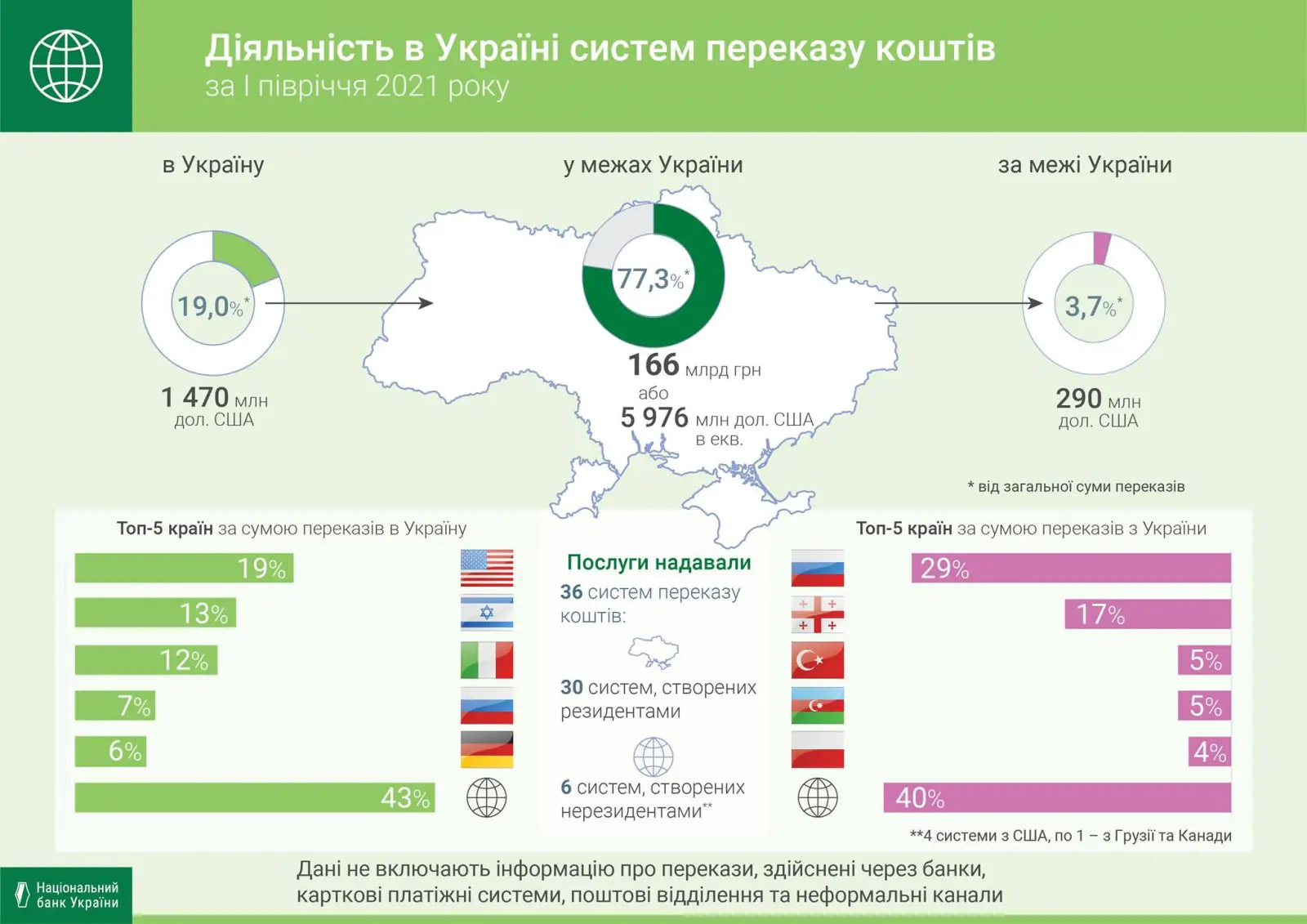 За попередніми оцінками НБУ, за перше півріччя 2021 року в Україну традиційними та неформальними каналами відправили 6,2 млрд доларів у еквіваленті. Зокрема, через системи грошових переказів кошти найчастіше відправляли зі США, Ізраїлю, Італії, Росії та Німеччини.