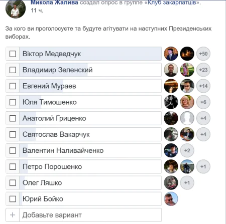 Вже наступного року закарпатці будуть обирати нового Президента України хто буде йти на цю посаду поки невідомо, але в соціальній мережі Фейсбук у «Клубі закарпатців», проходить опитування користувачів: «За кого ви проголосуєте та будуте агітувати на наступних Президентських виборах». Наразі в опитуванні абсолютним лідером досить несподівано є Віктор Медведчук, Петро Порошенко практично замикає опитування.