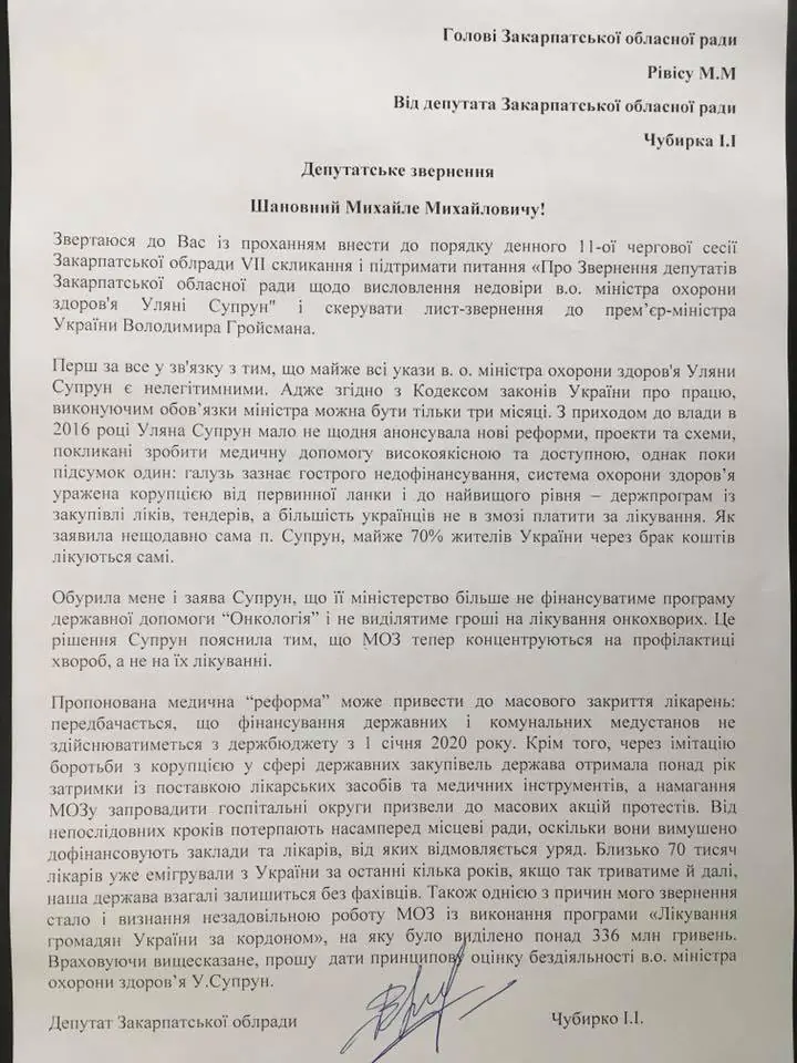 У Закарпатській облраді вважають за доцільне звільнити Уляну Супрун з посади в. о. Міністра охорони здоров’я України. Та проситимуть очільника Уряду невідкладно внести подання до Верховної Ради України про призначення Міністром охорони здоров’я України особи з належним рівнем освіти та компетентності.