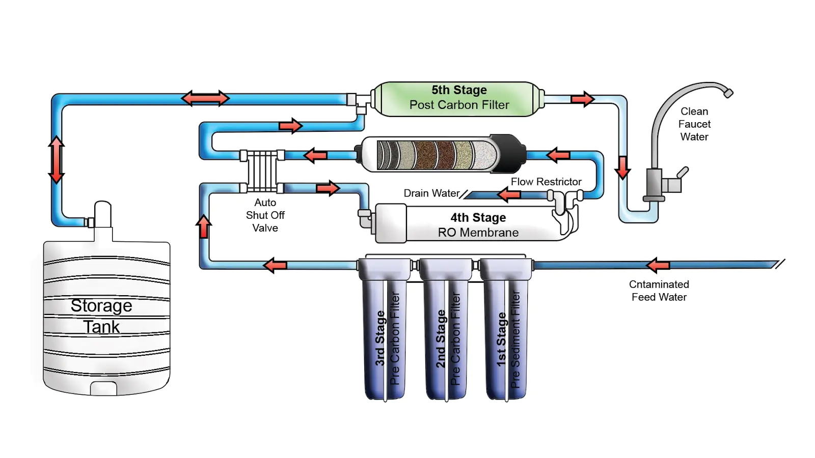 Вже очищена вода потрапляє у накопичувальний бак, оснащений іще одним вугільним картриджем. Крізь цей останній фільтр вона проходить перед тим, як витекти з крану і потрапити до споживачів.